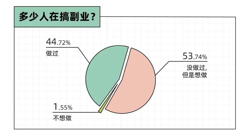 这意味着,看起来勤恳上班的打工人,几乎全都打过「悄悄搞副业,然后惊艳所有人」的小算盘。