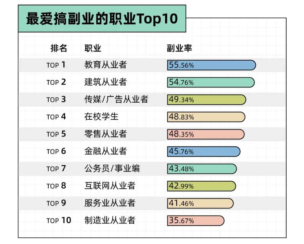 细化到职业上,数据显示,近4成年轻人的副业跟主业相关。于是,教育从业者最擅长利用资源,成为搞副业的主力军,排名二、三的分别为建筑从业者与传媒/广告从业者。