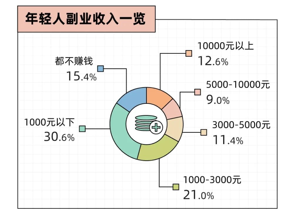 结果显示15.4%的年轻人没有通过副业赚到钱,近7成(67%)年轻人副业月收入不到3000元,真正靠副业月入10000元以上的只有12.6%。