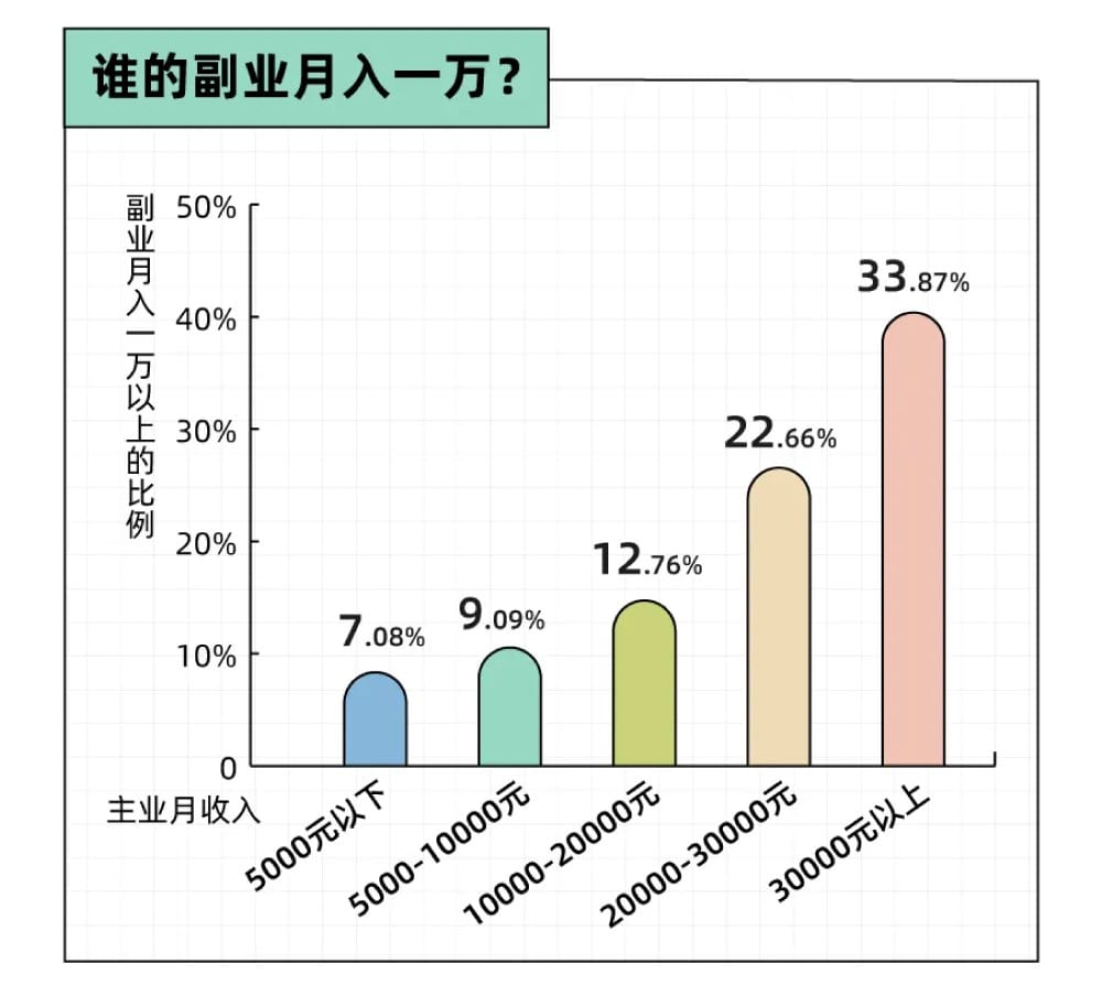 至于那些副业月入过方的人都是谁,我们也认真研究了一下,结果发现这跟主业收入也大有关系。那些本身月入超3W的精英人士,副业过万的比例也最高。