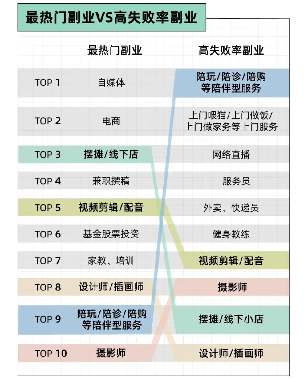 当我们把最热门副业与高失败率副业交叉来看,会发现有些副业同时上榜。