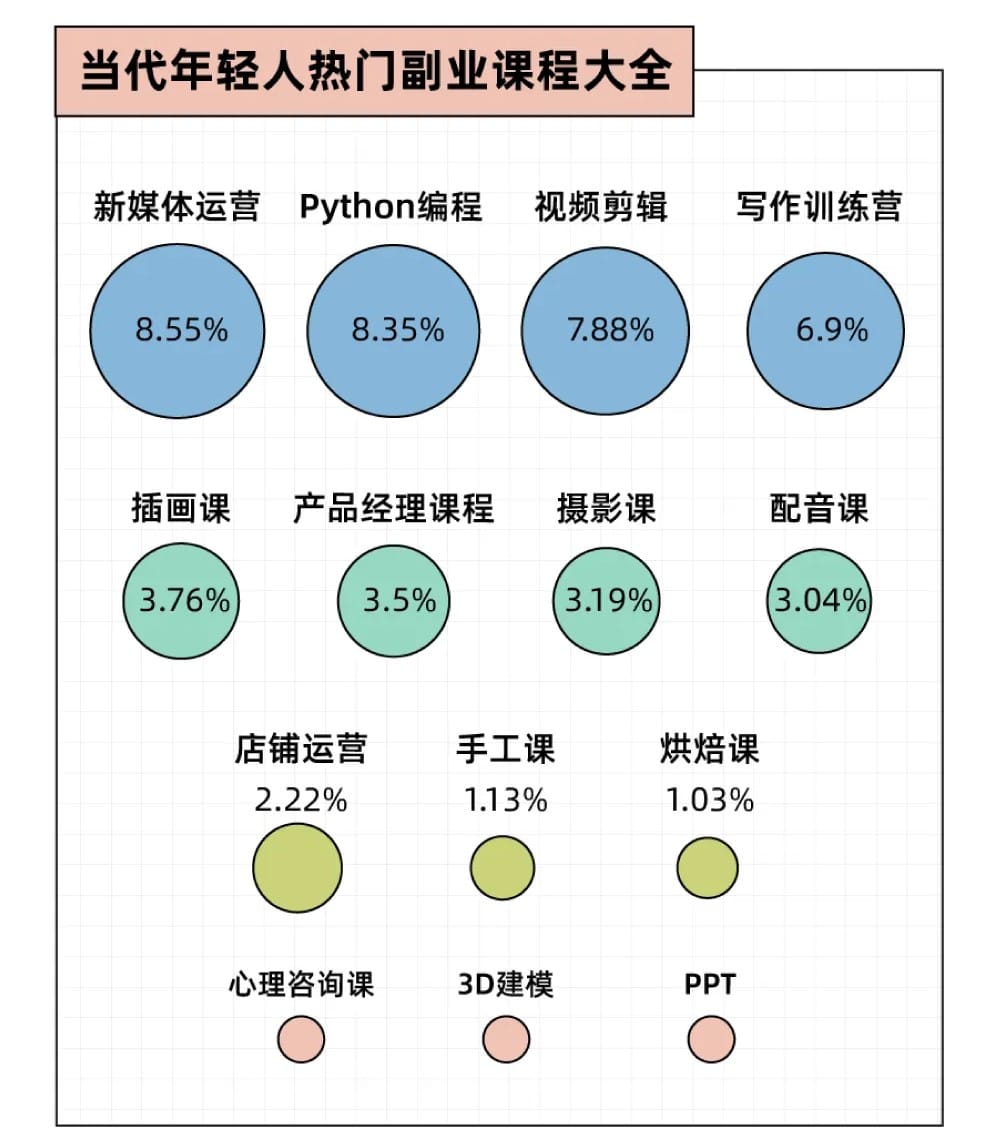 其中,新媒体运营(8.5%)成为副业学习的第一热门,Python编程与视频剪辑也紧跟其后。